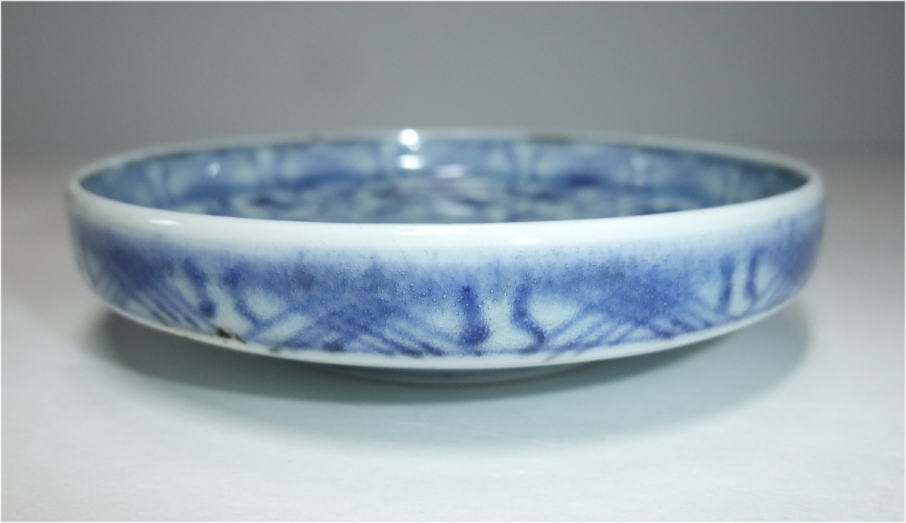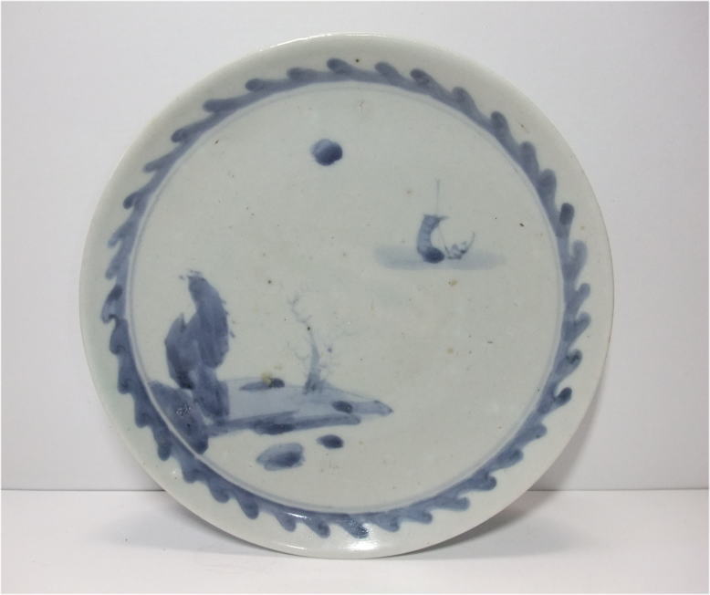 No.26040105 \100,000(1客) 初期伊万里風景文中皿。 寛永。 初期伊万里の様式としては最初期の年代に制作されている作品となります。白磁を活かし山水風景文を豪華な絵付けで描いています。上部に太陽、帆掛け船が描かれており遠近があって図柄に深みが出ています。縁周りには波文様を描き見た目を引き締める効果を演出しています。初期伊万里の無傷作品は最近数少ないのでお勧め致します。 傷なし1客あります。 18.4cmW×3.7cmH |