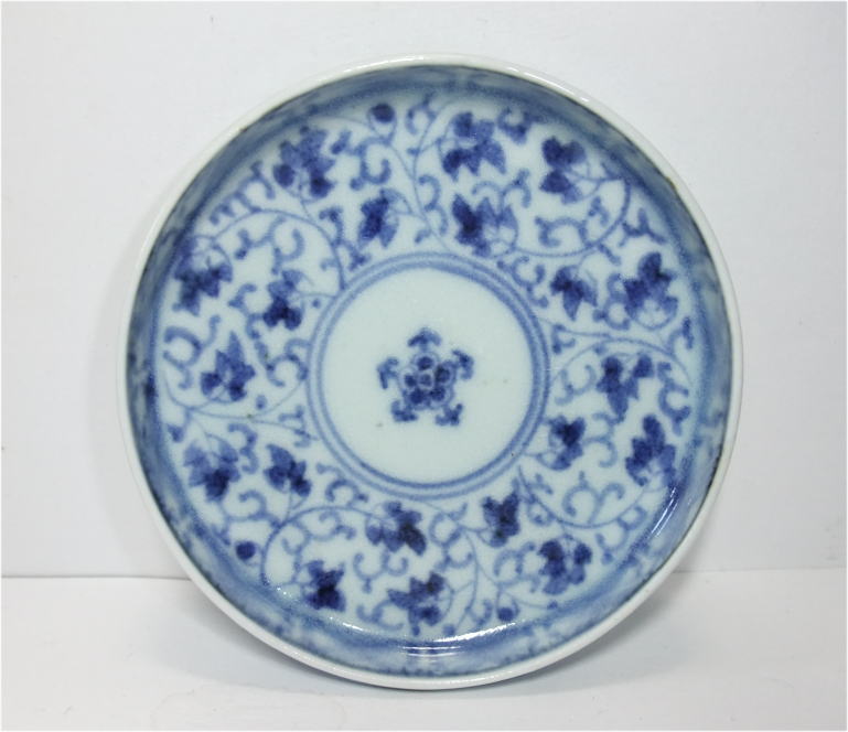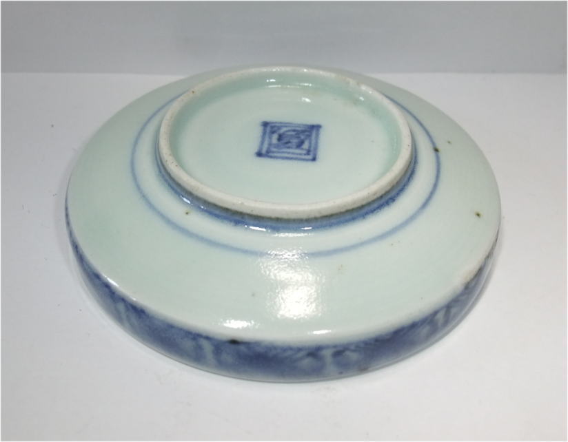 染付萩唐草盤形小皿。 享保。 見込みに五弁花、縁文様に萩唐草文を描いた作品です。縁が直角に立ち上がった盤皿の器形となっています。とても可愛らしい一品に仕上がっています。縁が立ち上がったタイプなので色々な用途でお楽しみ頂けると思います。 傷なし6客あります。バラ売り、セット売り、どちらでも可。 10.2cmW×2.2cmH |