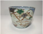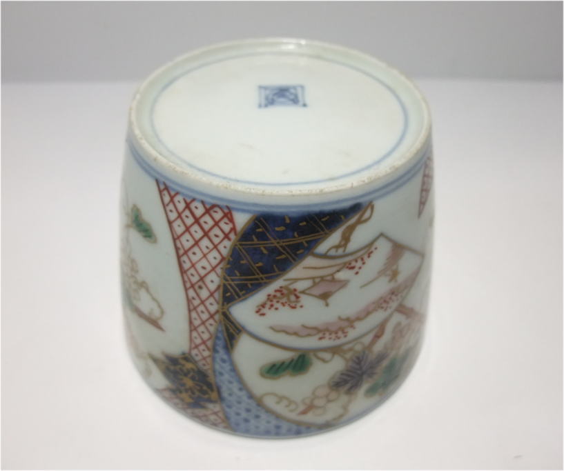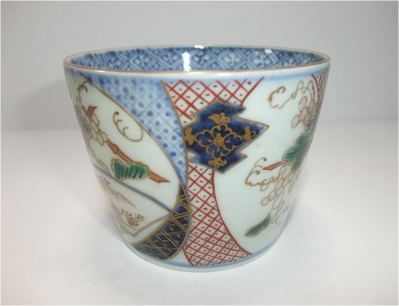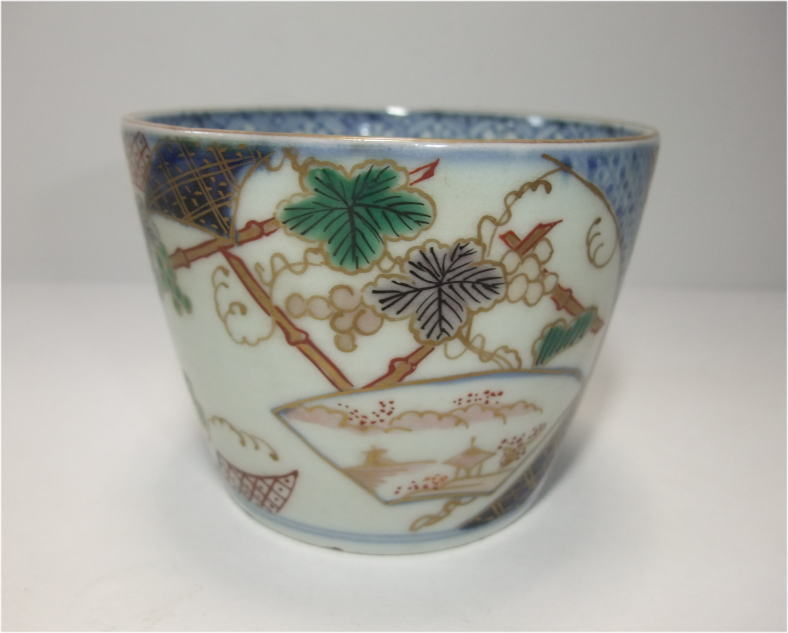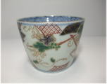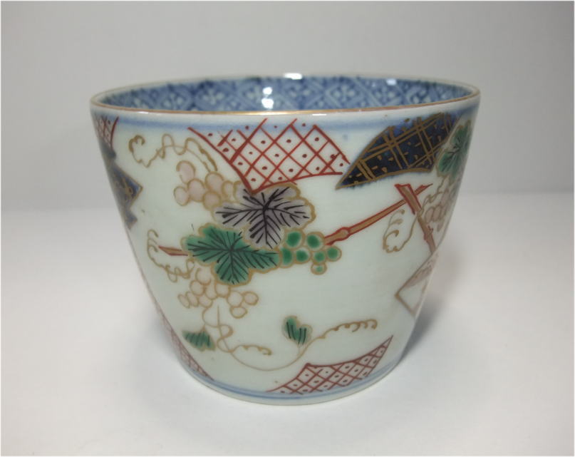No.26040103 \9,000(1客:高台小ホツ) 染錦葡萄文蕎麦猪口。 宝暦。 蕎麦猪口としては大振りの作品となっています。内側は染付で五弁花、外廻りには染付と綺麗な色釉薬を使用して帯を作り内側に細かく絵付けを施して白磁部分いは葡萄文を丁寧に描いています。生地も薄手に成形された上手作品です。 9.6cmW×6.8cmH 傷なし10客売約済 |