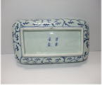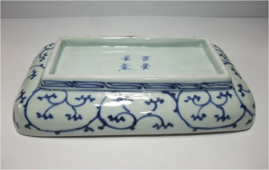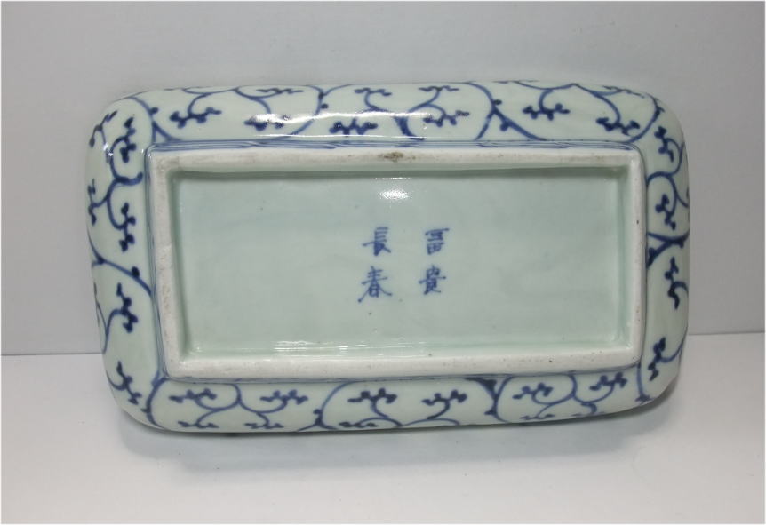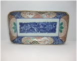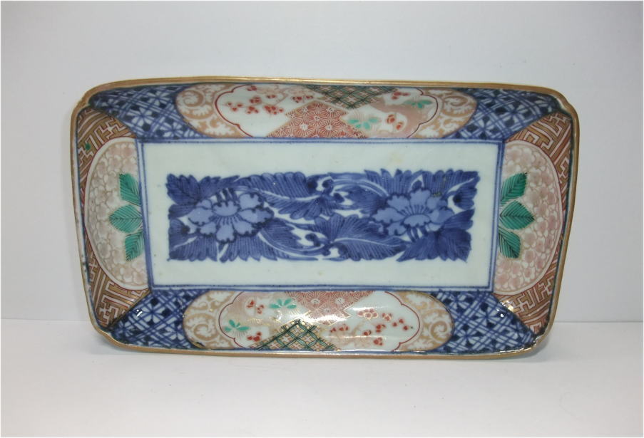 | No.26040104 \15,000(1客) \70,000(5客セット) 染錦草花文長皿。 宝暦。 見込みに染付で牡丹文、縁文様には上下の下地に染付で格子文、窓枠には色釉薬と金彩を使用して白抜き唐草に松竹梅文、左右は緑と金彩を中心に雷文に草花文を描いています。裏は染付で宝暦期独特の唐草文を描いて富貴長春銘でまとめています。見た目も鮮やかで上手に仕上がった一品です。 傷なし 21.7cmW×12.8cmL×3.8cmH 1客売約済 |